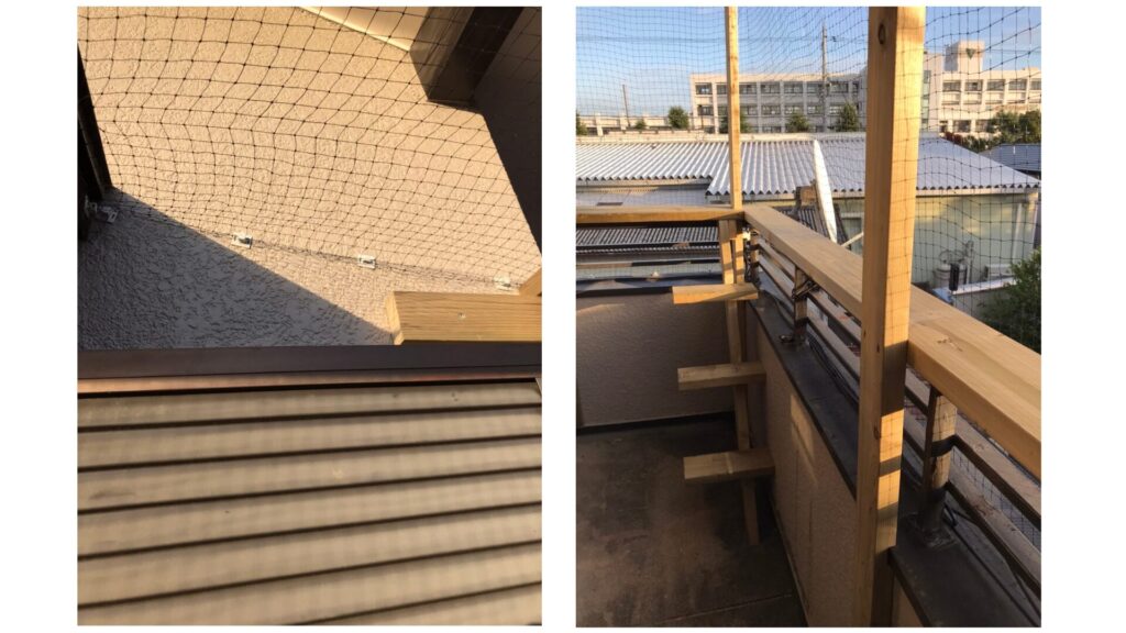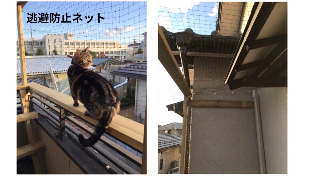 滋賀県守山市内のA様邸にて、猫のベランダから脱走防止対策として、逃避防止ネットの設置工事を行いました。