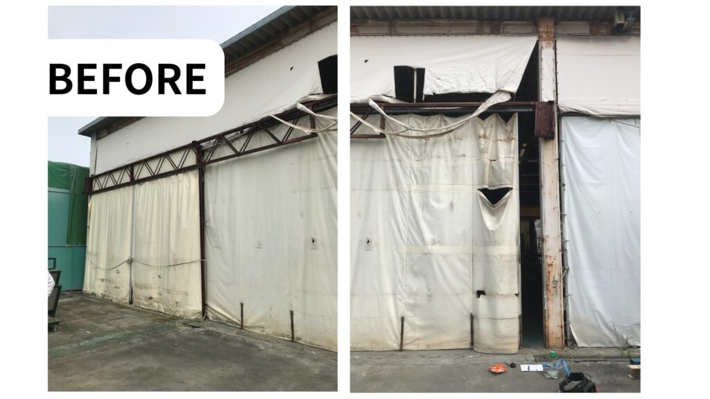滋賀県湖南市の金属加工会社様にて、倉庫棟の入口を保護するパイプ入りカーテンおよび上部固定張り生地の交換工事を行いました。