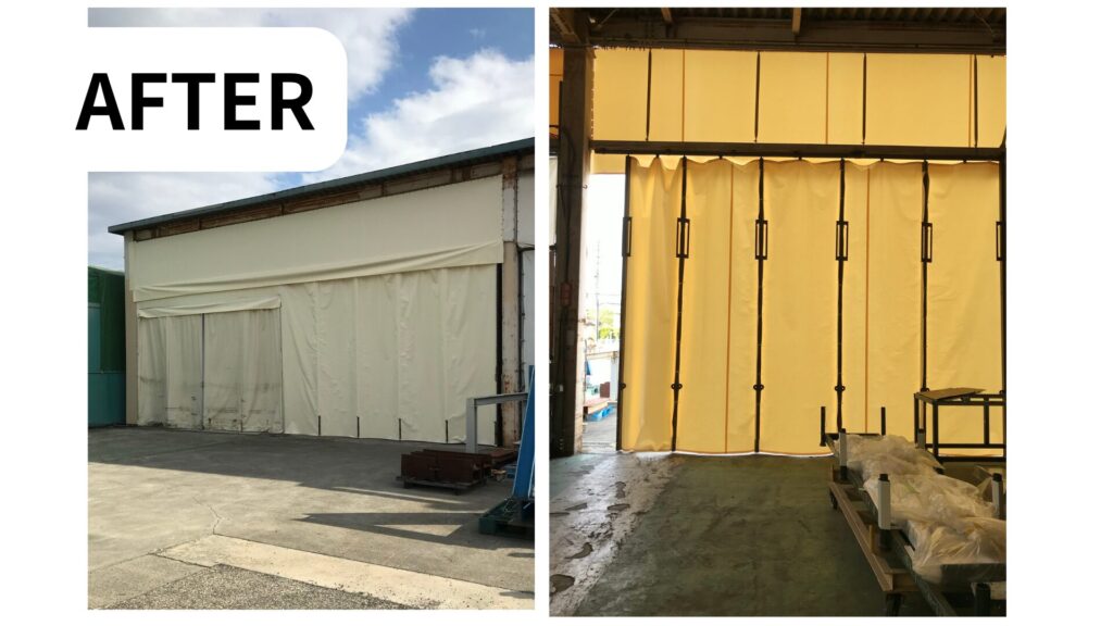 - コストを抑えた部分改修: 劣化が激しかった上部固定部と右側のジャバラ部分をメインに張替えを行い、まだ継続使用が可能だった左側のカーテンは既存のものを活用。お客様のご予算と設備の状況に合わせた、最適な部分リニューアルを実現しました。