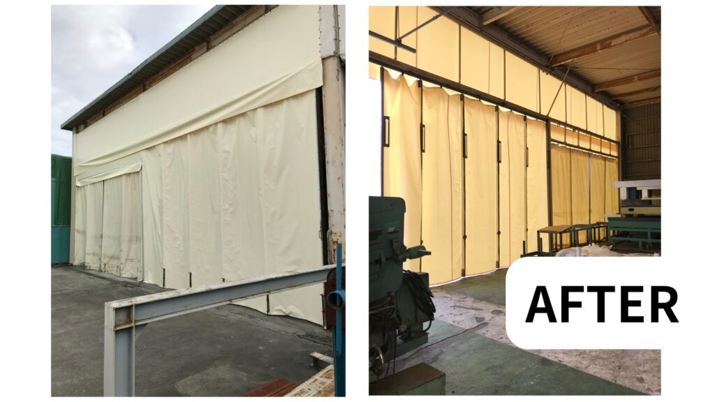 【滋賀県湖南市】金属加工工場の倉庫パイプ入りカーテン・固定張り生地張替え