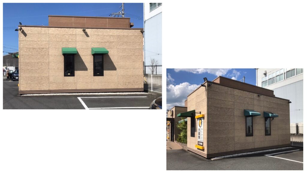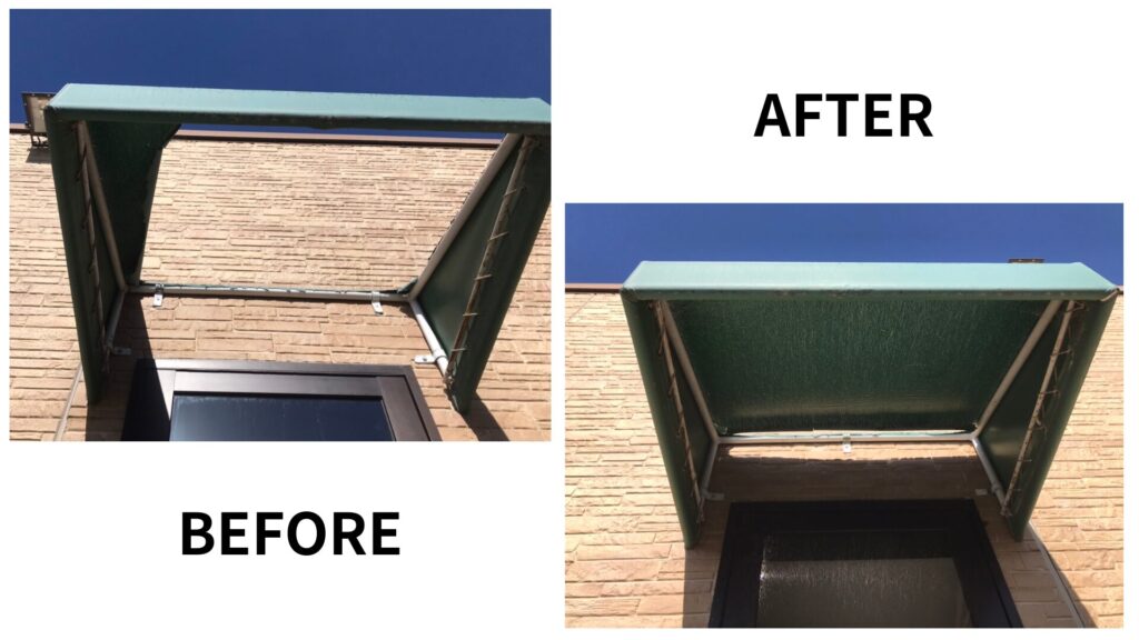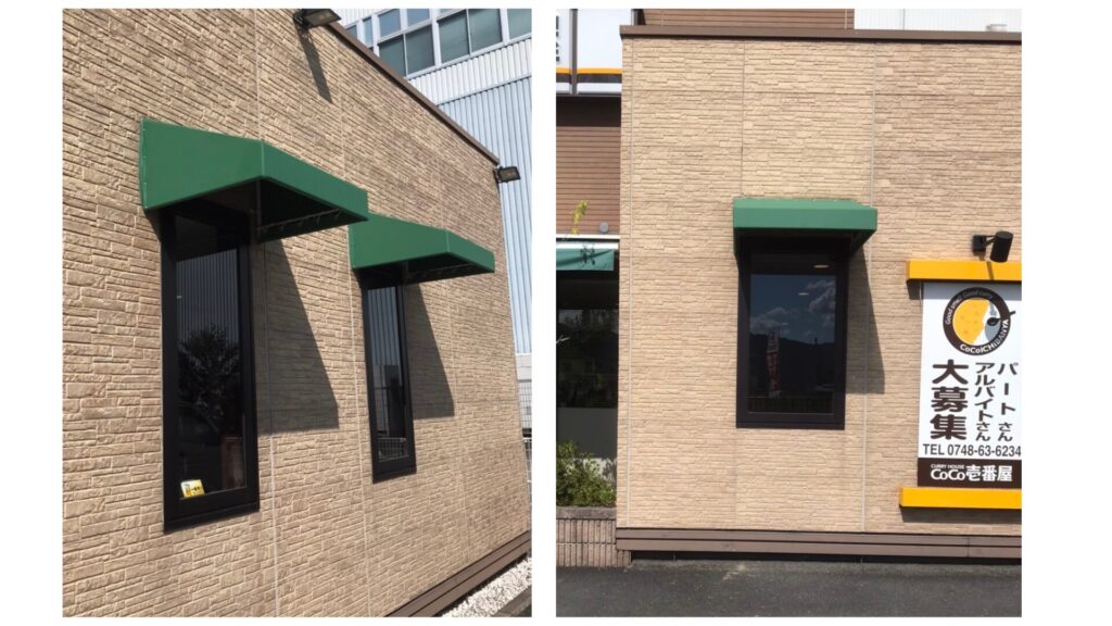施工後は、雨よけ・日よけとしての本来の役割をしっかりと果たし、窓周りの保護性能も大幅に向上しました。さらに、テント下に生まれる陰影が建物に立体感を与え、外観全体に清潔感と安心感をプラスしています。ご来店されるお客様にも、「外から見た印象が良くなった」「丁寧に管理されているお店だな」と感じていただける仕上がりになったのではないかと思います。