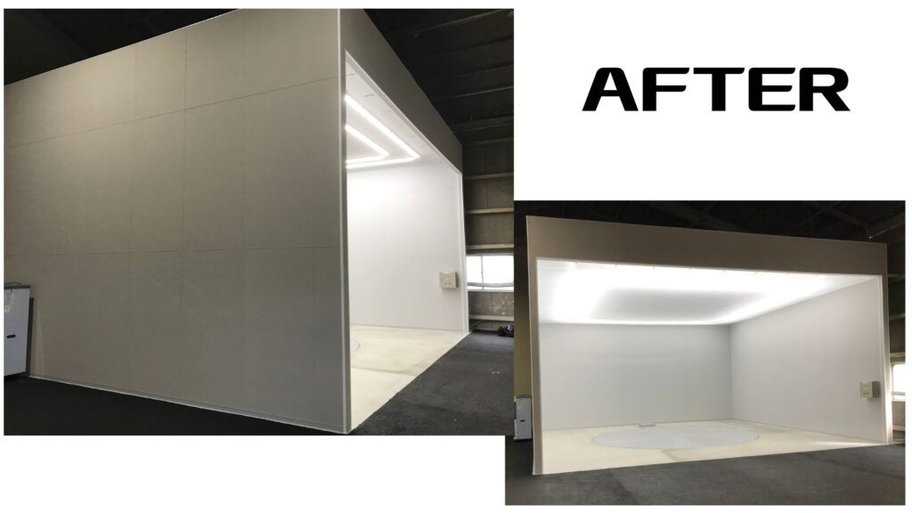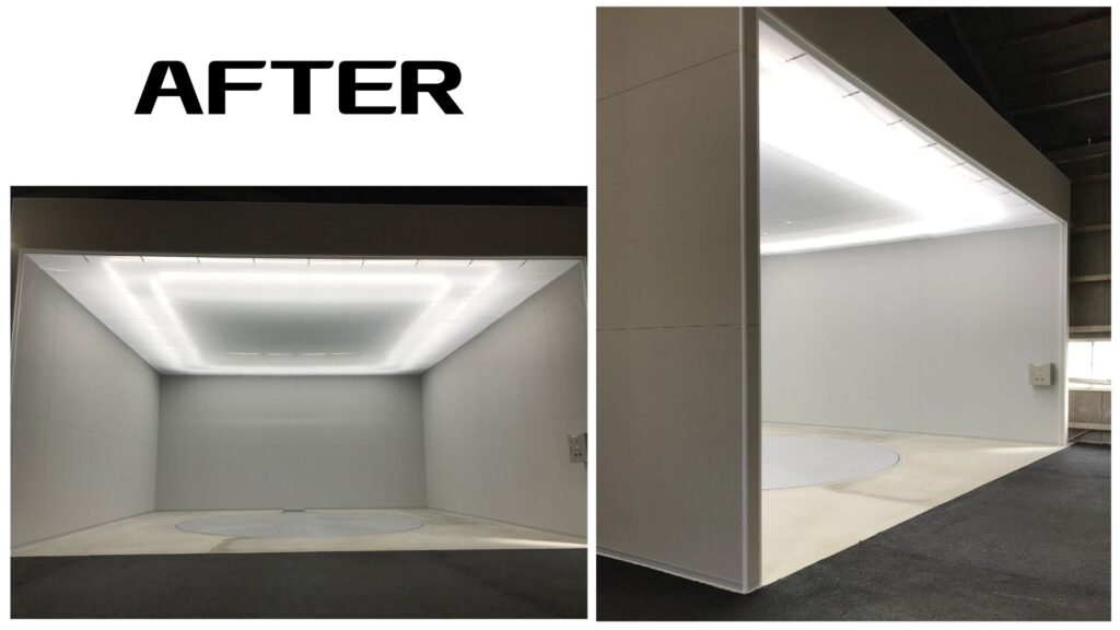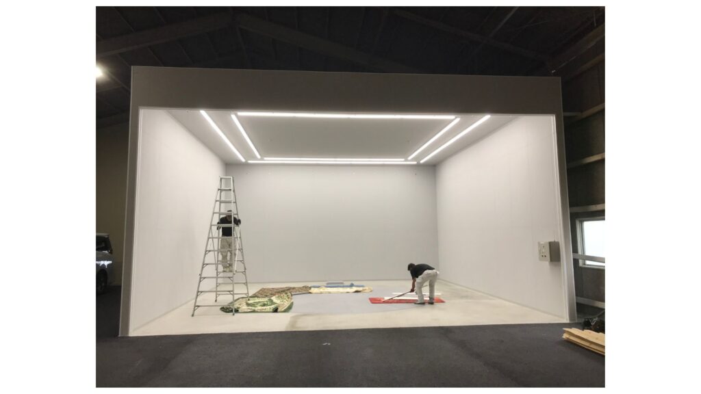滋賀県草津市にあるカーディーラー様にて、倉庫内の車撮影用ブースの天井内側へのビニール固定張り施工を行いました。