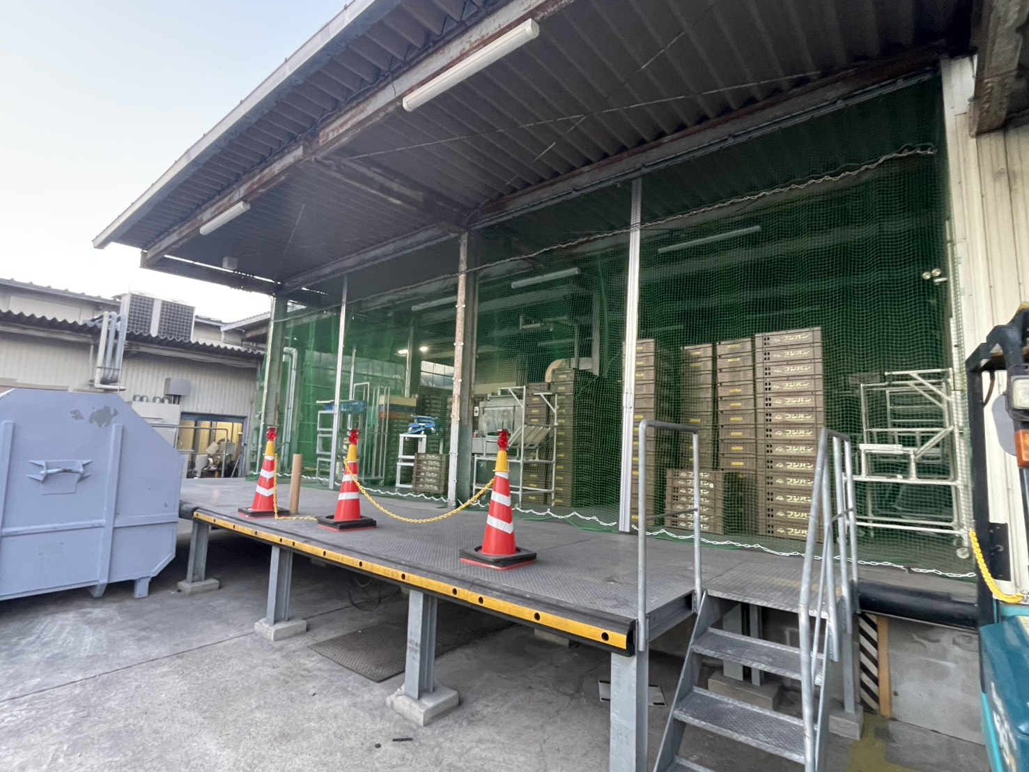 今回の施工では、出荷・搬入スペースにおける害虫侵入対策を目的として、開口部にメッシュカーテンを設置しています。