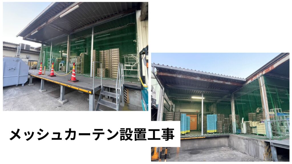 愛知県稲沢市にある食品工場様にて、メッシュカーテンの設置工事を行いました。