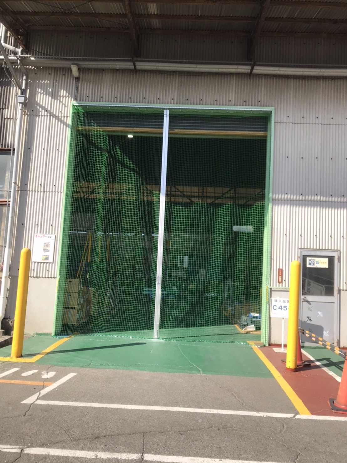 今回の施工では、シャッター開口部に開閉式の防鳥ネットカーテンを設置。